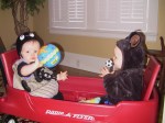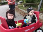 We left the park and headed back to our street, where we stopped by neighbors’ houses to show off the babies and turn down candy offers. Of course, Katie and I weren’t counting on 75 degrees and sun when we ordered Jackie’s monkey suit, so she seemed relieved when we finished our tour up and down our street.