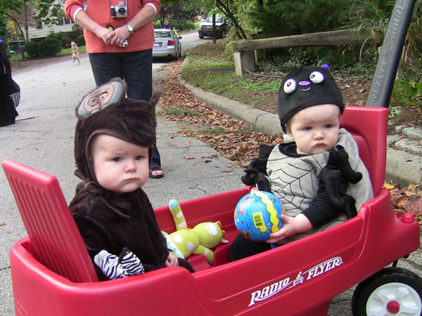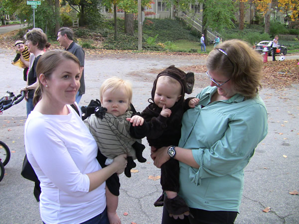We left the park and headed back to our street, where we stopped by neighbors’ houses to show off the babies and turn down candy offers. Of course, Katie and I weren’t counting on 75 degrees and sun when we ordered Jackie’s monkey suit, so she seemed relieved when we finished our tour up and down our street.