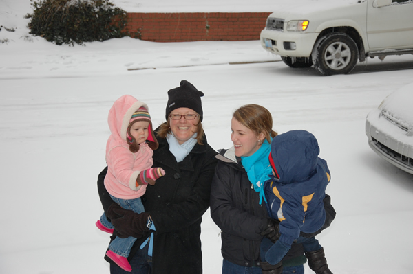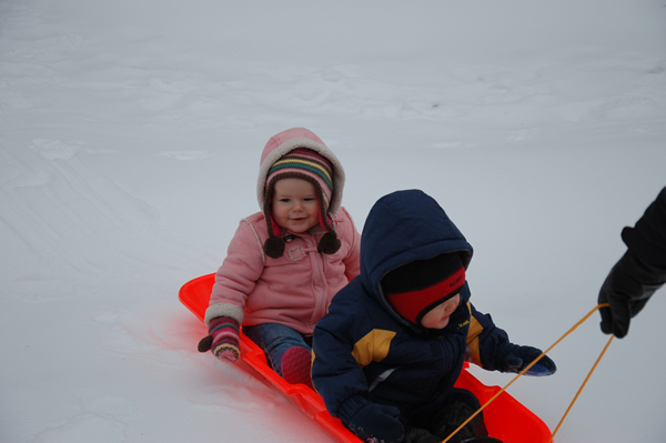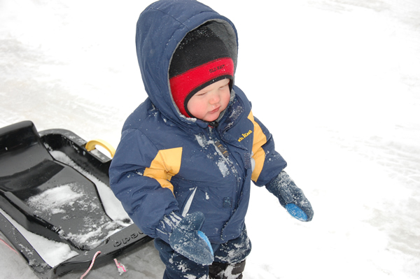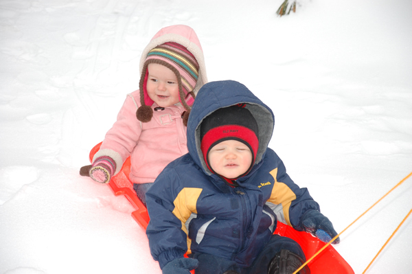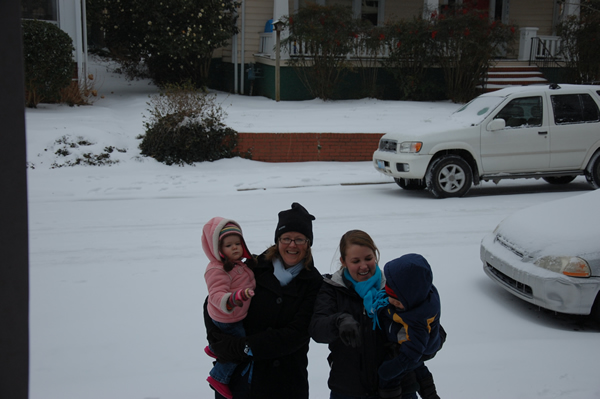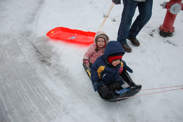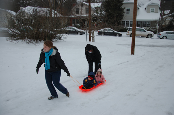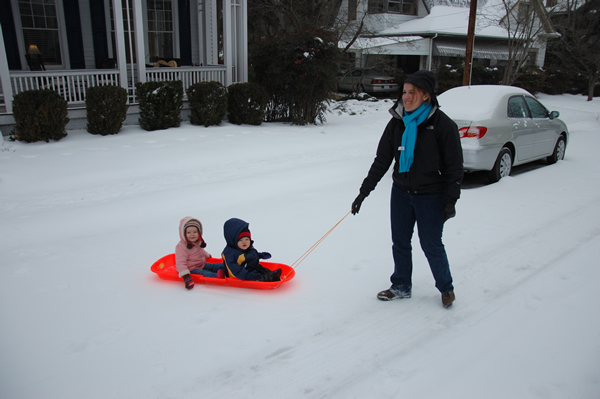 Jackie and her cohort Drew had their first real taste of snow after several inches fell in Raleigh last night and this morning. Of course, 20 minutes of getting the little ones ready led to only 15 minutes of good sledding before the youngsters got cold and ornery, but we really had a blast. I’m proud to say that Jackie and I held our own in head-to-head racing with the Blair duo from down the street.