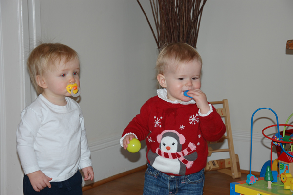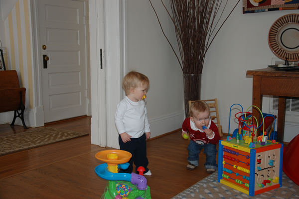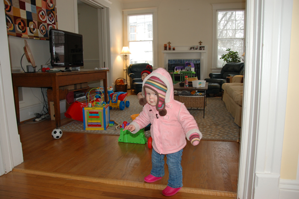 Jackie is no longer a baby now that she is walking here, there, and everywhere. Before Christmas she had a breakthrough — 12 or 14 consecutive steps. A few days after Christmas, with burgeoning confidence, she was walking anytime she had the chance. Nowadays, it’s not unusual to see her do a lap around our foursquare house with a sippy cup in one hand and a maraca shaking in the other. Here’s some video from December 29, 2009.