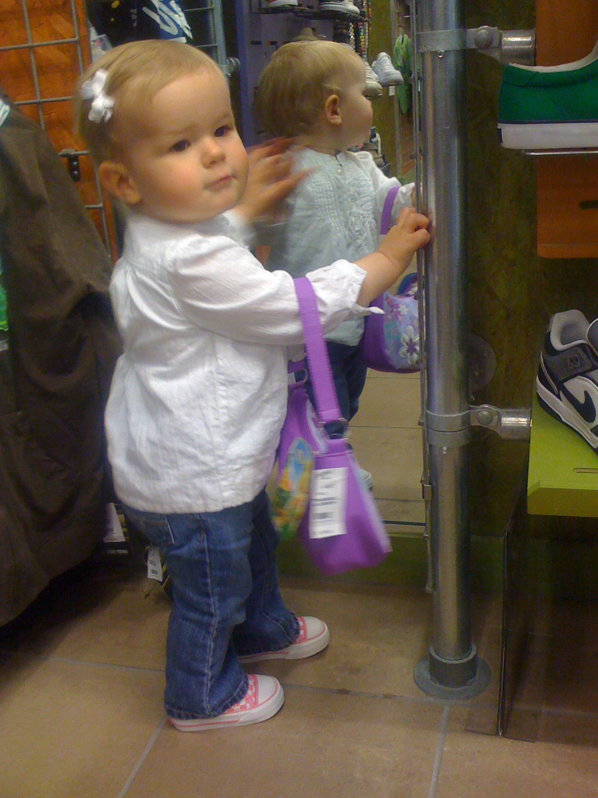 On Saturday, we were browsing shoes and I found some fly pink Vans in a size 5. We secured Jackie’s little feet with the velcro straps and helped her to the floor so she could try them out. She walked directly to a handbag display, deliberately plucked a lavender purse from the rack, and proceeded to the floor-to-ceiling mirror. Katie and I watched on as she admired her couture for several minutes; we finally had to coax her away from her newly-accessorized reflection. Here are a couple of pictures.