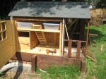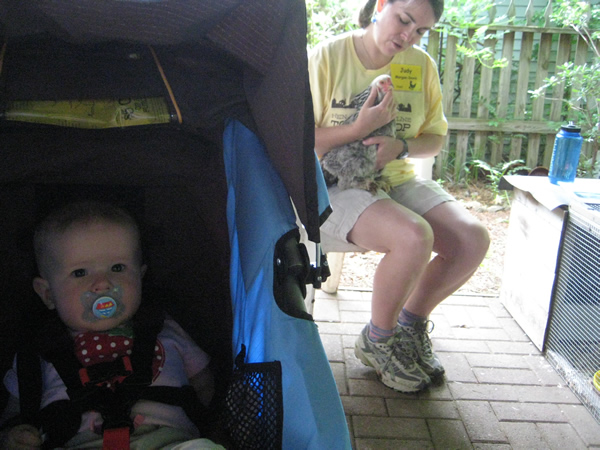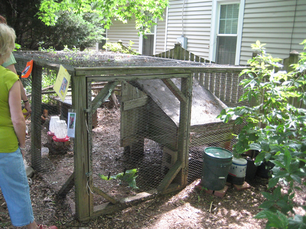The good news is that Jackie and I were able to make the fourth annual Tour d’Coop, which showcased more than 20 different urban chicken coops inside (hen-side) Raleigh’s I-440 beltline. Six of the coops are within a one-mile radius of our house, so Jackie and I set out on foot/stroller to check them out.