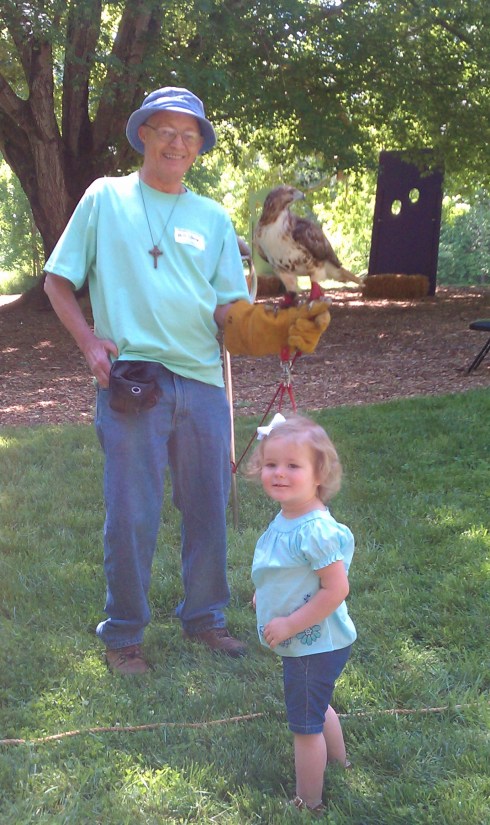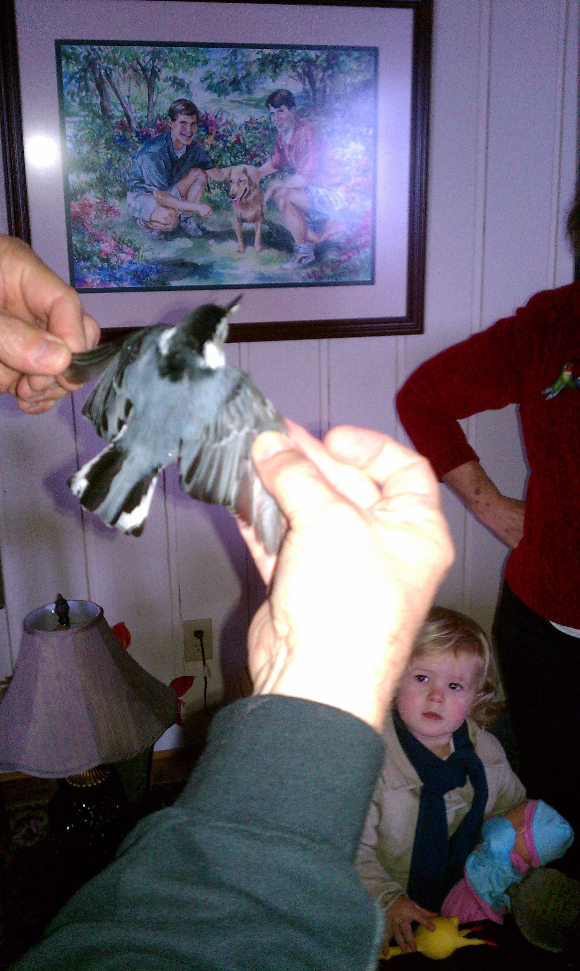 I took this one right after Christmas. It’s the kind of picture you could hand to students in a creative writing class and say, “Write the short story. You have one hour to complete this final exam.” My father and I were attempting to show Jackie a real (and dead but frozen) bird up close. She wasn’t sure what to make of the brief experience. I love the picture though. Note the portrait of Rich, Maggie, and me hanging on the wall. Also note the small rubber chicken under Jackie’s hand.