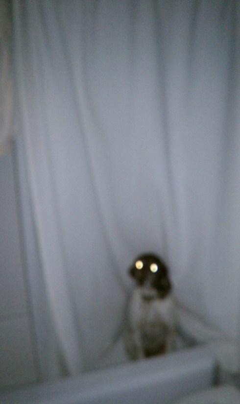 Here’s an unintentionally spooky picture of Baxter quivering with fear in the bath tub. Let me explain. We had some heavy weather in Raleigh this past spring. As in other parts of the country, a lot of people in Raleigh and the rest of NC were victims of tornadoes. You would think by looking at him that he’s waiting out a storm. He’s not. Whenever Baxter hears a lawnmower outside, he gets completely terrified and goes to his safe place.